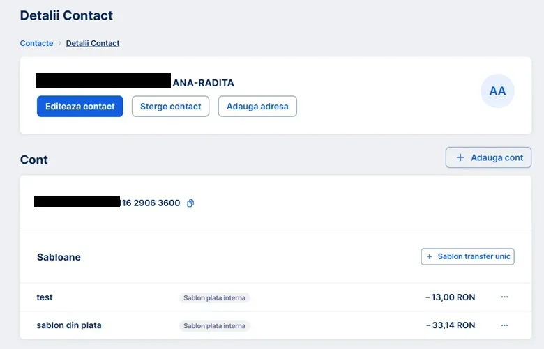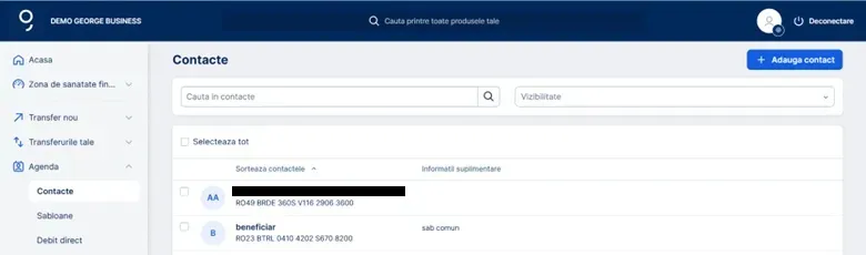 În meniul „Contacte”, găsești toate contactele de afaceri pe care le-ai creat, împreună cu conturile asociate necesare pentru operațiunile bancare. Detaliile relevante, cum ar fi IBAN-ul sau adresa, sunt completate automat atunci când inițiezi un transfer nou.