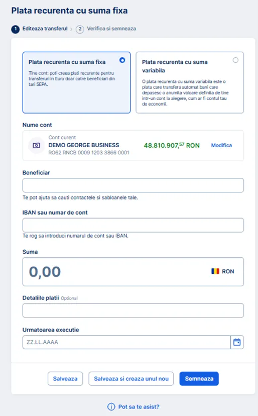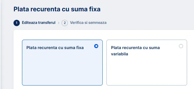 3. Acum poți alege să creezi o plată recurentă cu sumă fixă sau variabilă. Pentru instrucțiuni privind plata recurentă cu sumă fixă, continuă să citești; dacă dorești să creezi un ordin cu sumă variabilă, fă clic aici.