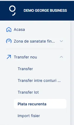 1. Din meniul principal, accesează meniul din partea stângă a ecranului și fă clic pe „Transfer nou”. Din lista derulantă, selectează opțiunea „Plată recurentă”. Apoi, alege contul din care dorești să inițiezi ordinul de plată recurentă.